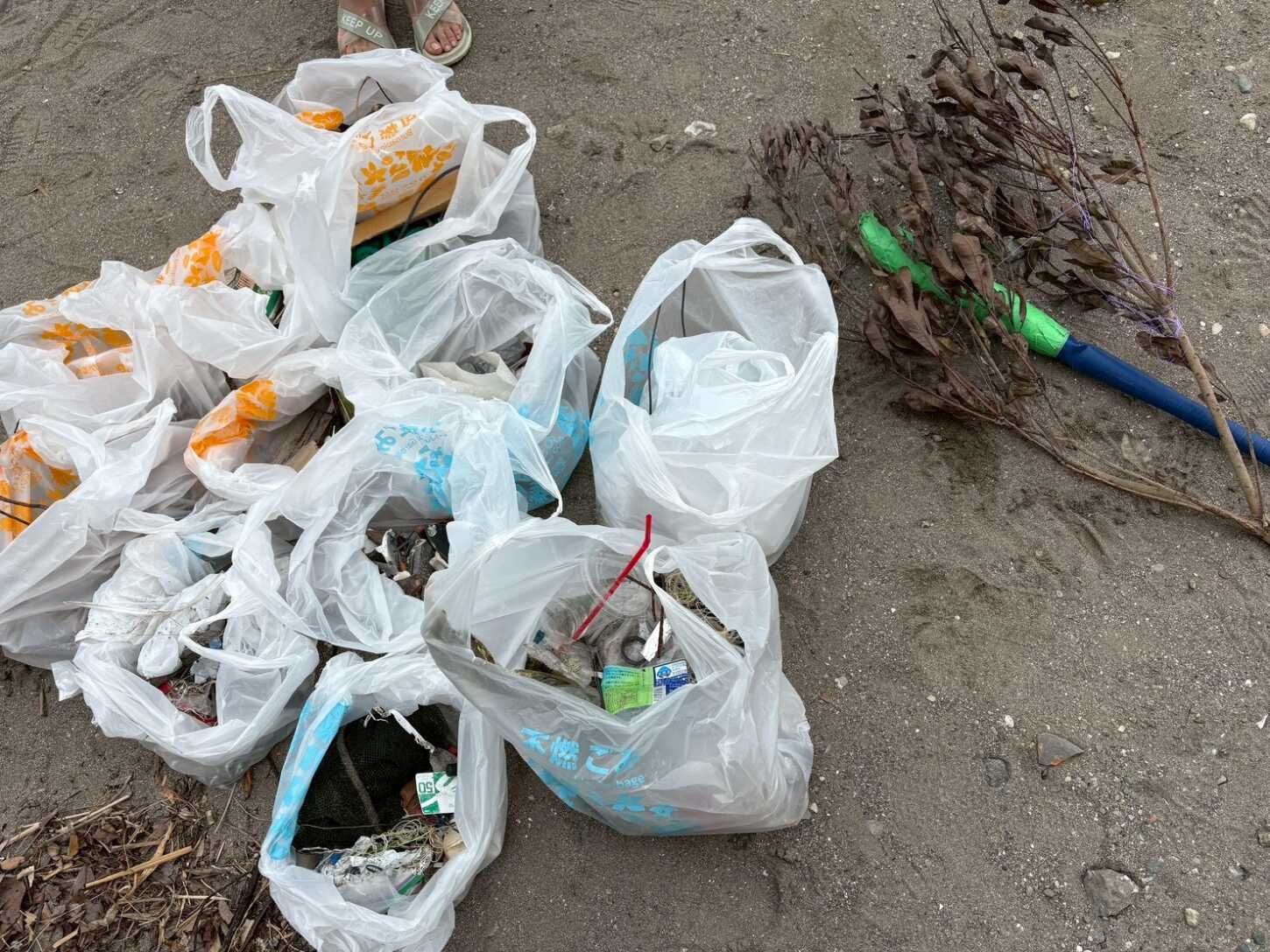 2025年10月19日(日)ここたまプロジェクトはクリーン活動部8名で森戸海岸を清掃しました。ガラス片や陶器片がとても多くて驚きました。又、釣り針のついた釣り糸が海藻や枝に絡まって落ちていたり、釘、針金、プラスチック片、依頼、人形などなど、危険な物から驚く物までありました。遊びに来ていた方々からは「これお願いしまーす」と声を掛けて頂いたり、楽しく清掃活動出来ました。