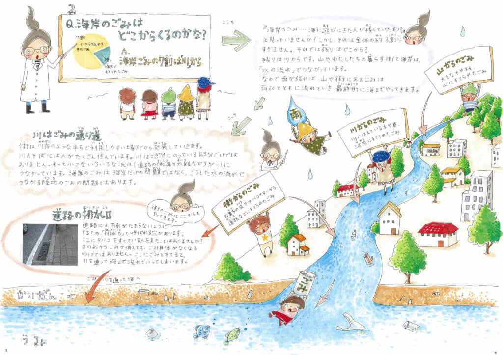 海岸にはどんなごみがあるのか? どこから来るのか? 動物たちへの被害は? 等の内容を親しみやすいイラスト等で表現され、子どもから大人まで読めば納得、見れば満足な楽しく学べる教科書になっています。
